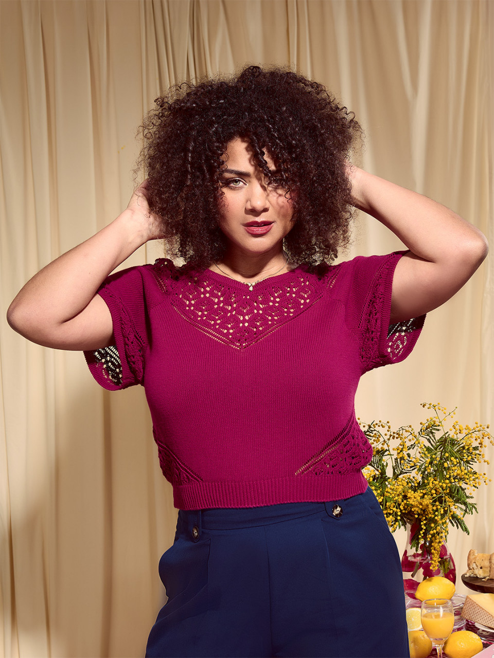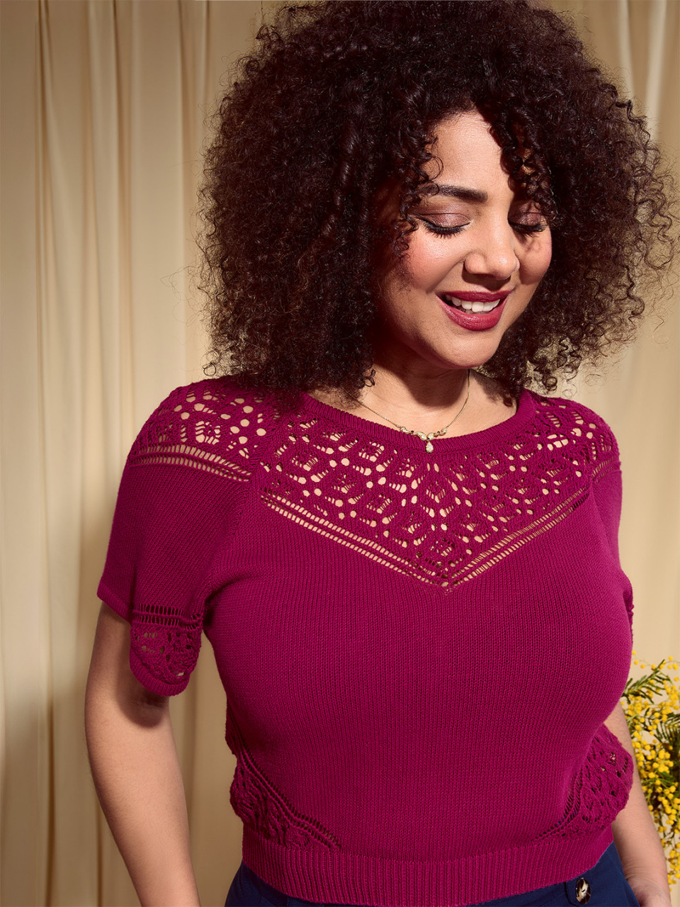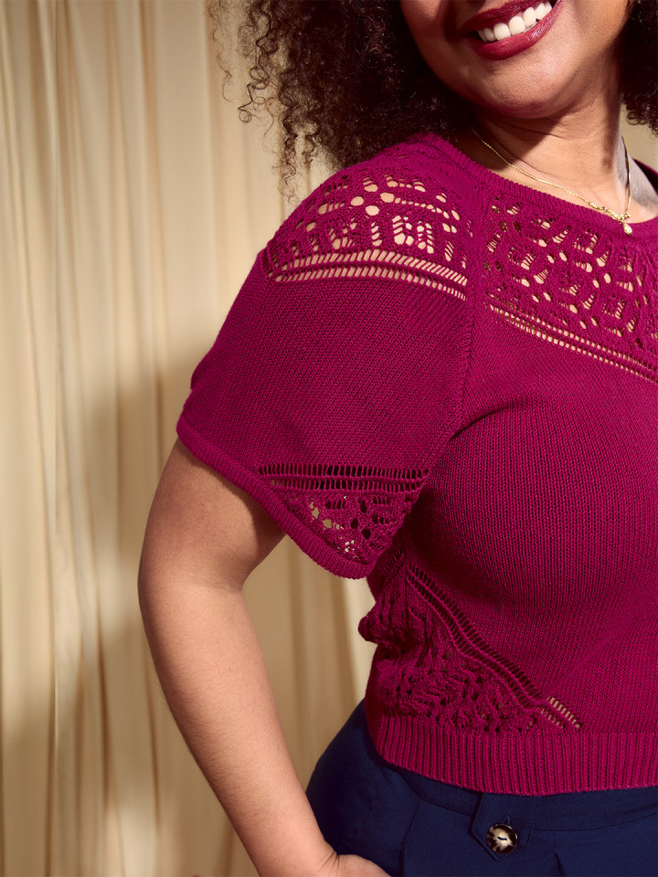 • Détails ajourées sur le bas de manche et sur les côtés