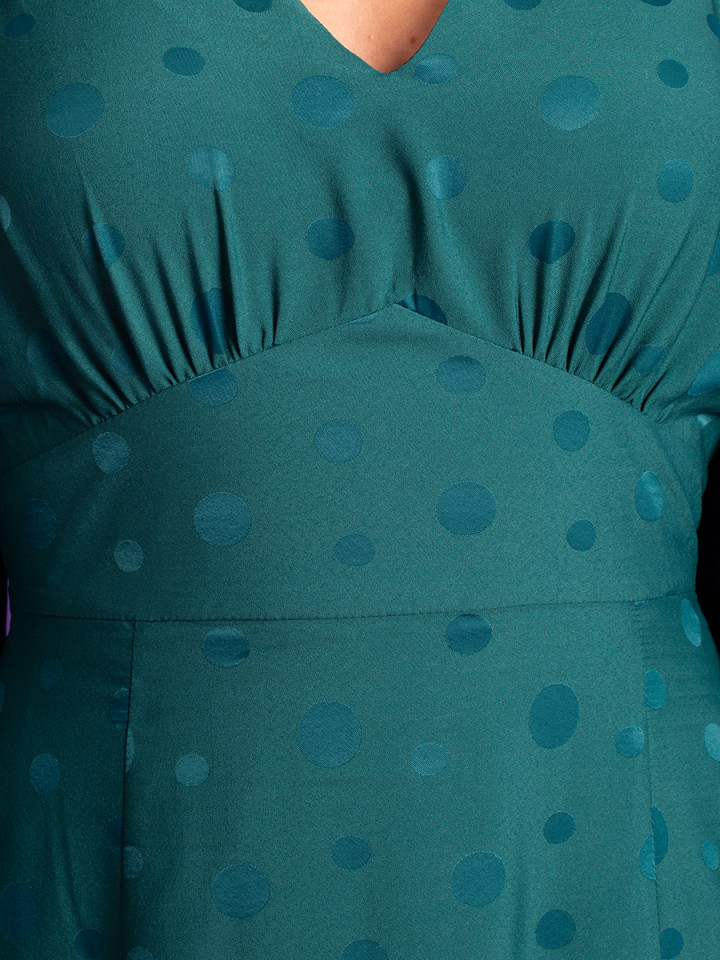 • Taille haute avec bande de ceinture forme V inversé et détail de fronces à la poitrine