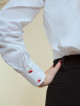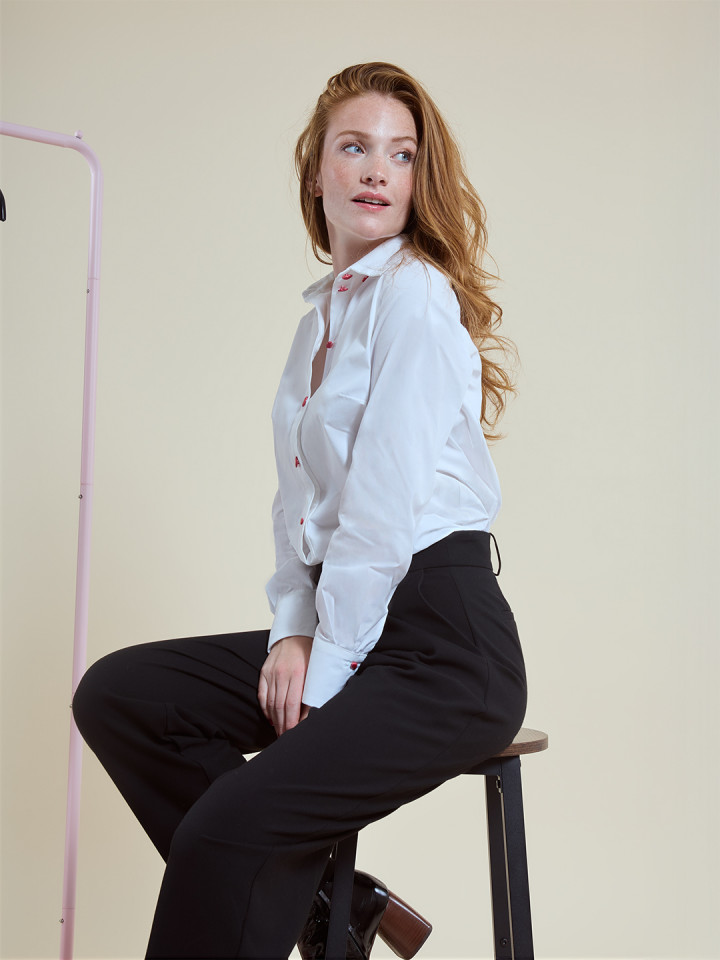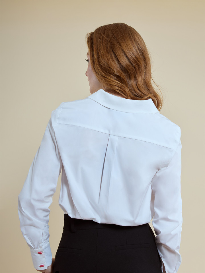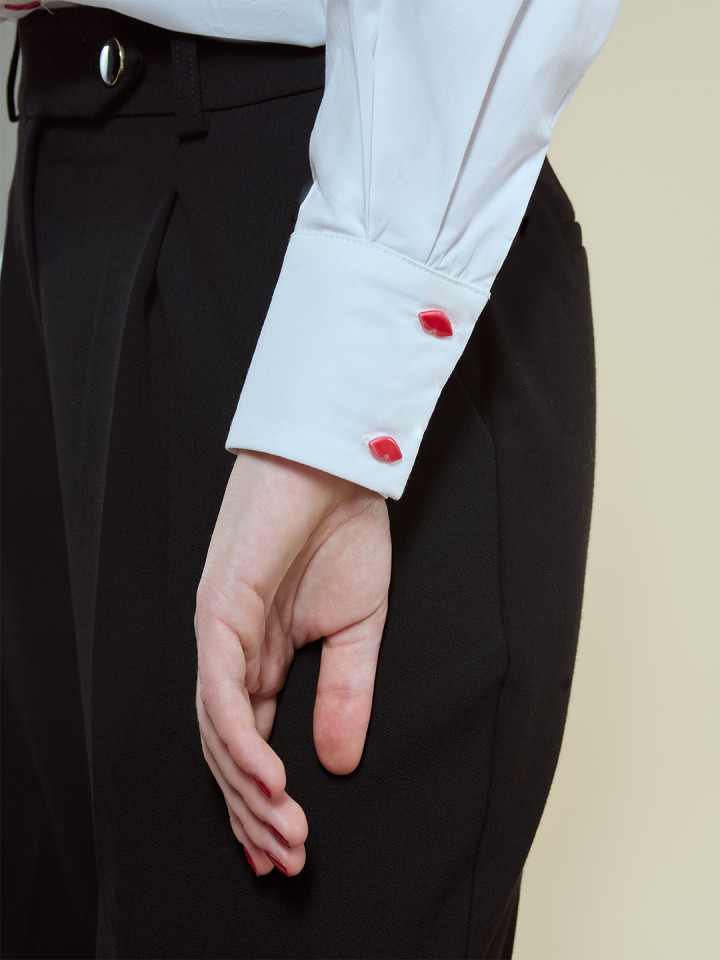 • Manches avec bande de poignet resséré et détail de boutons vernis bouches